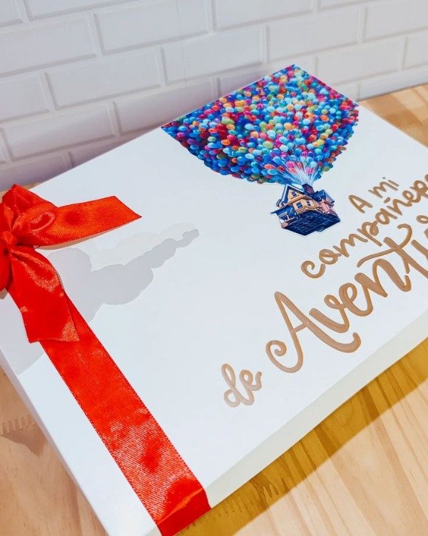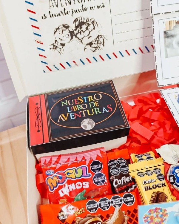1 mini box interior con el logo del Libro "Nuestro Libro de Aventuras" en el cual hay una libreta para personalizar en tamaño A6 y Polaroid 6x9cm (10 unidades).